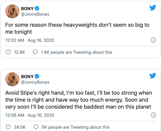 “Avoid Stipe’s right hand, I’m too fast, I’ll be too strong when the time is right and have way too much energy. Soon and very soon I’ll be considered the baddest man on this planet.”